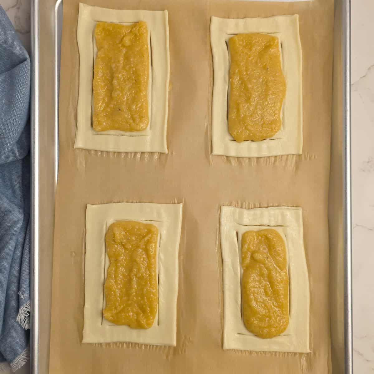 - Step 3: Add the filling to the middle of each rectangle, then brush the edges with the egg wash. Bake for 15 minutes.