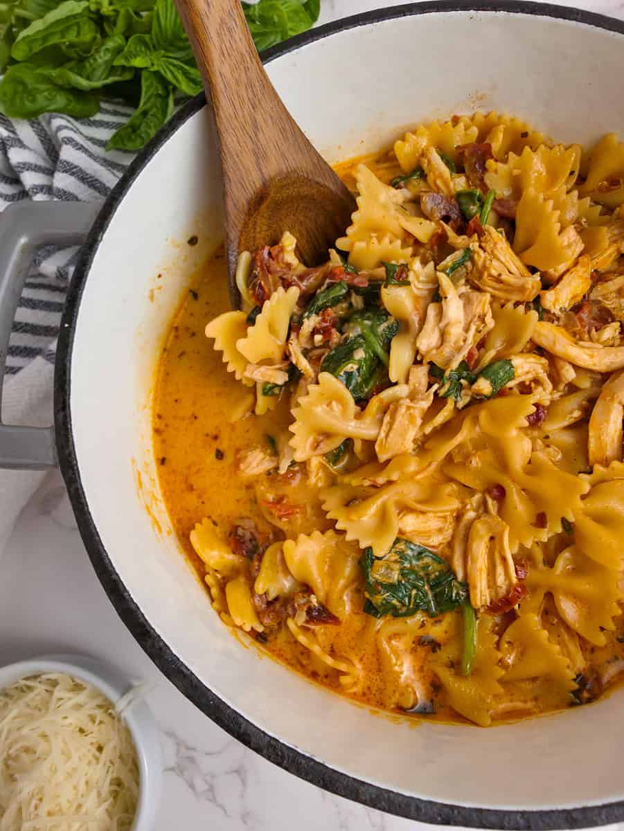 - Add the chicken, spinach, parmesan cheese, heavy cream and basil to the pot. Stir to combine and cook just until the spinach is wilted. Enjoy!