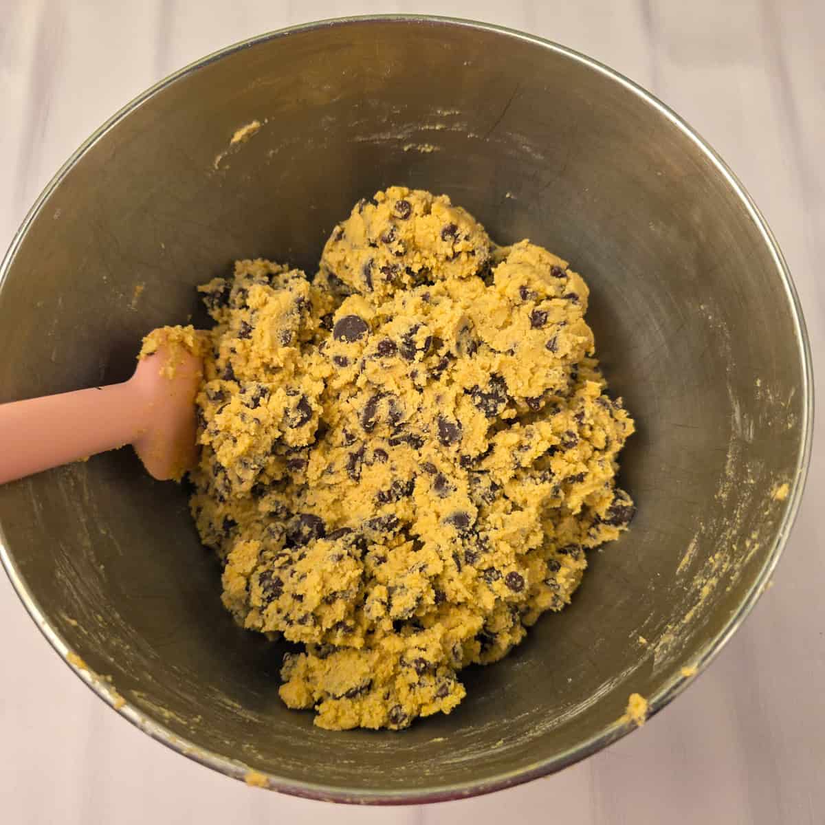 - Slowly add the dry ingredients to the butter mixture, mixing just until fully incorporated. Stir in the chocolate chips until fully incorporated.