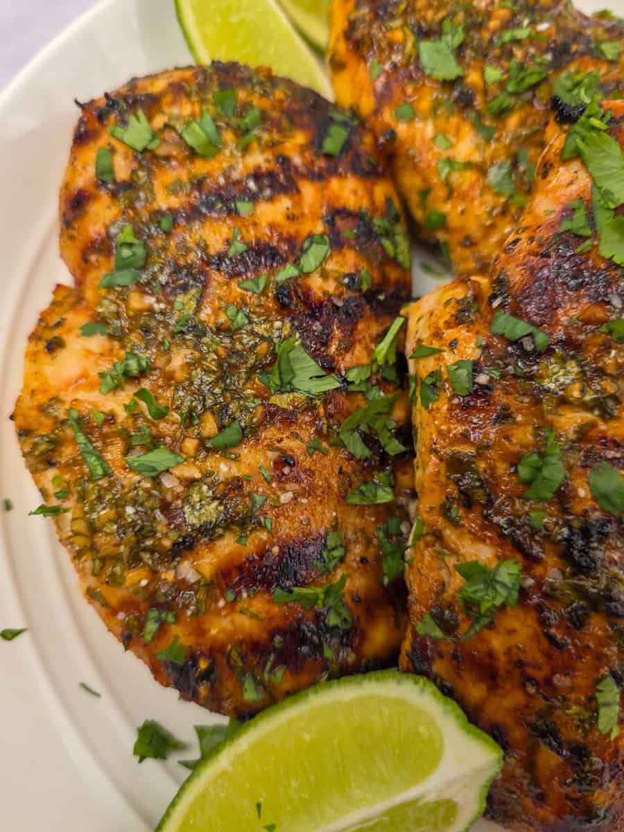 Grill until the internal temperature reaches 165°F when temped with a thermometer. Garnish with cilantro and fresh lime juice. Enjoy!