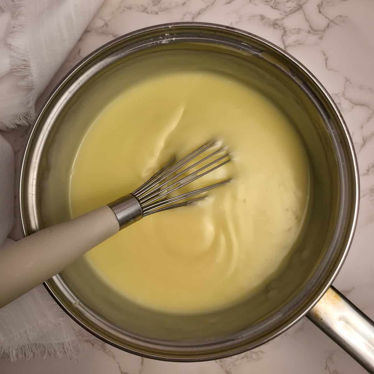 - Slowly mix the milk mixture into the saucepan with the sugar mixture. Turn the heat to medium and cook, whisking constantly. The mixture will start to boil, keep whisking until thickened. This usually takes 6-8 minutes. The custard should be nice and thick when you remove it from the heat.