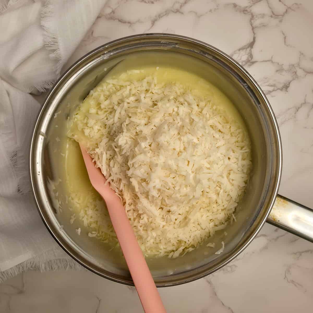 - Remove from the heat and stir in the butter, one at a time. Now stir in the vanilla extract and shredded coconut.