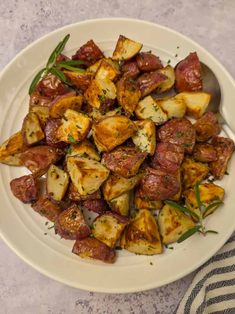 I prefer red potatoes because they have a thin, delicate skin that crisps up quickly without the need for peeling. However, Yukon Golds are also a fantastic choice if you want an extra buttery interior. If you choose to use Russets, just be sure to cut them into slightly smaller pieces because they don't roast as fast.