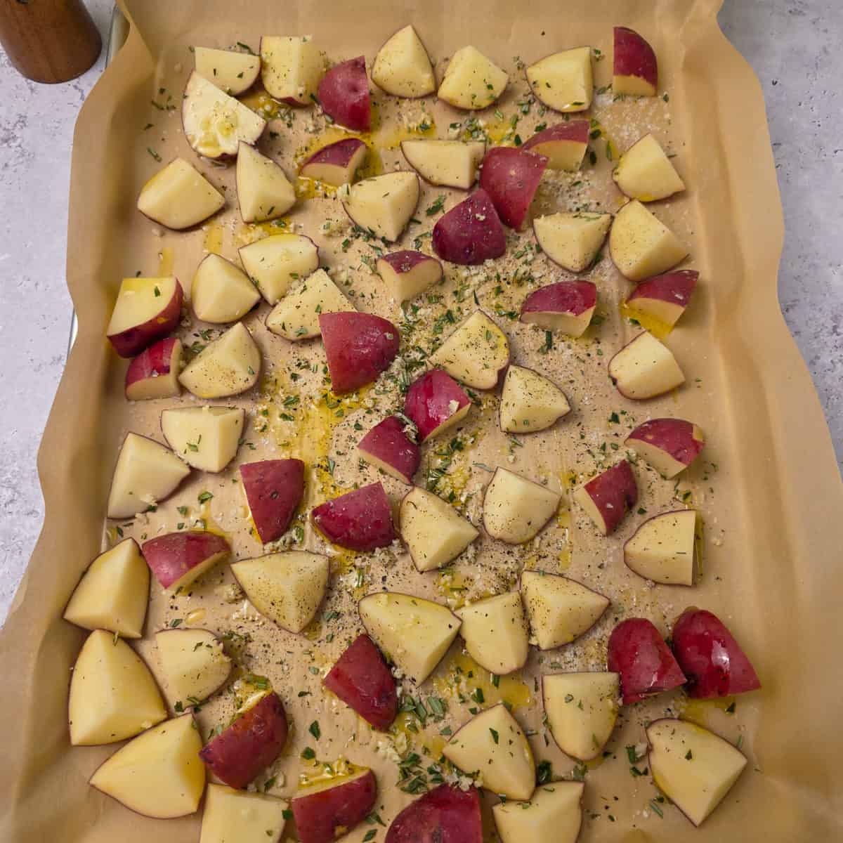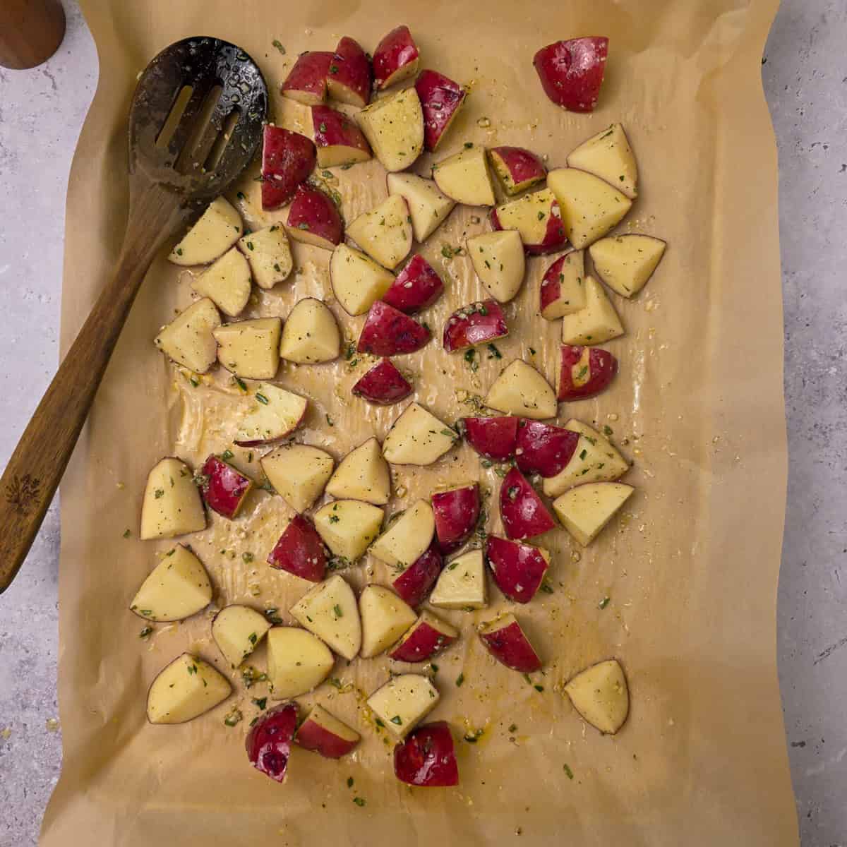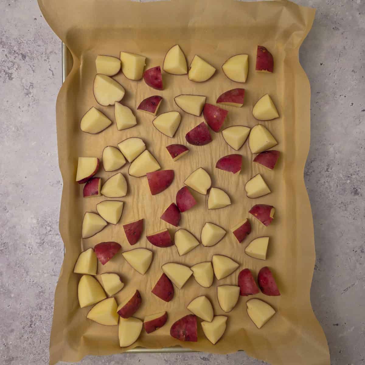 - Cut the potatoes into 1-inch pieces and spread out on a parchment lined baking sheet.