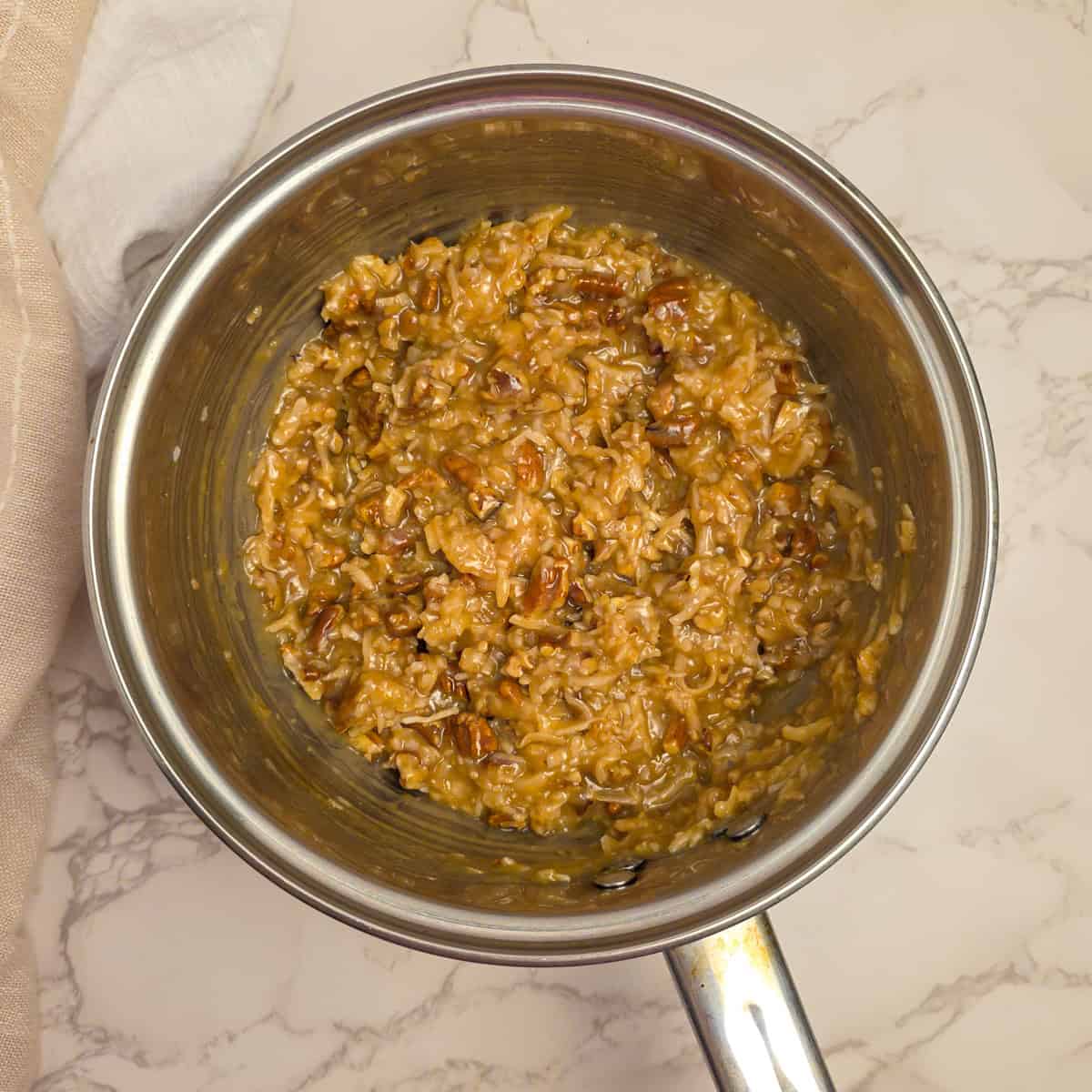- Step 4: In a medium saucepan, combine the butter, sugars, egg yolks, and evaporated milk. Mix until smooth. Heat over medium heat, stirring constantly until the mixture is thick enough to coat a spoon.