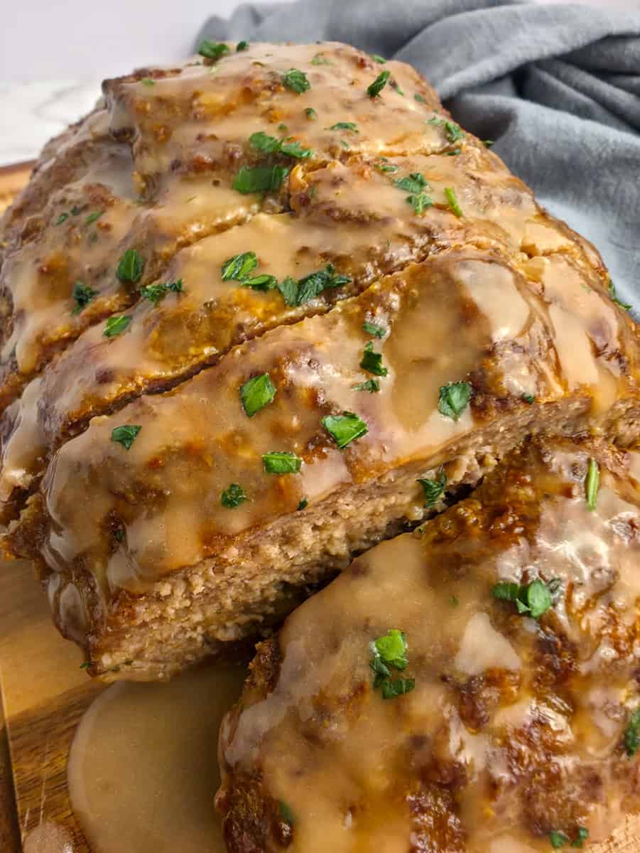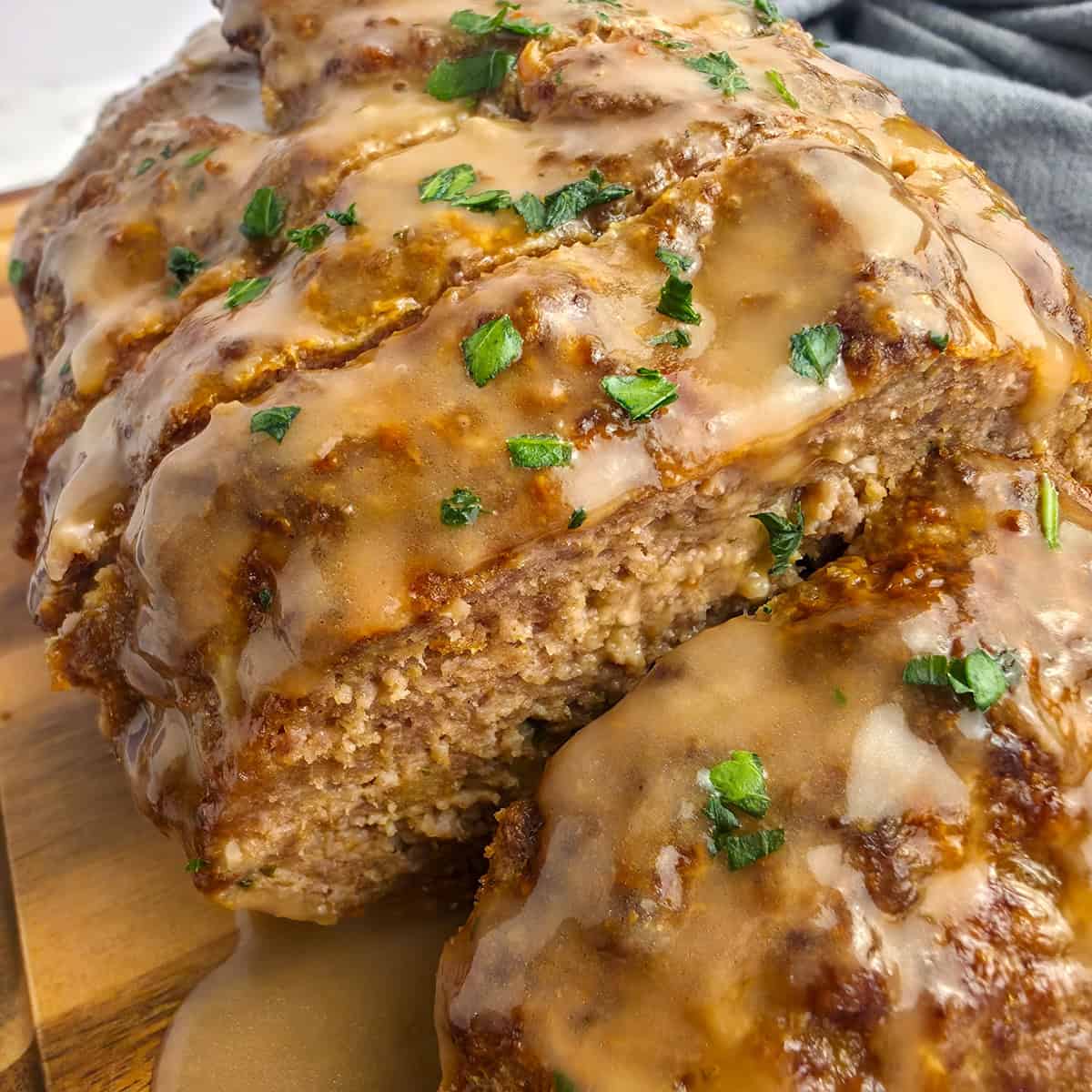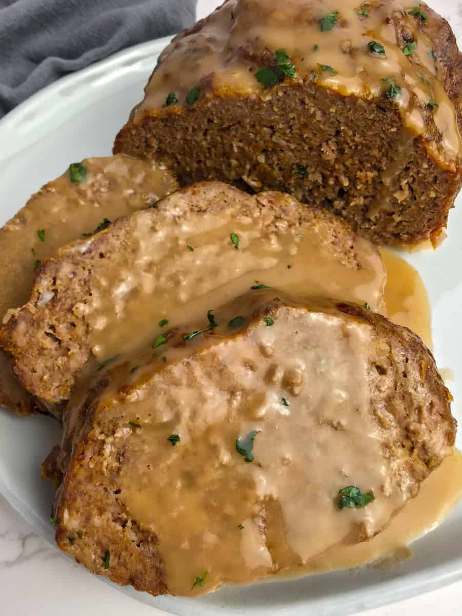 - Slice the meatloaf and serve it with the gravy spooned over the top. Serve the remaining gravy on the side. Enjoy!