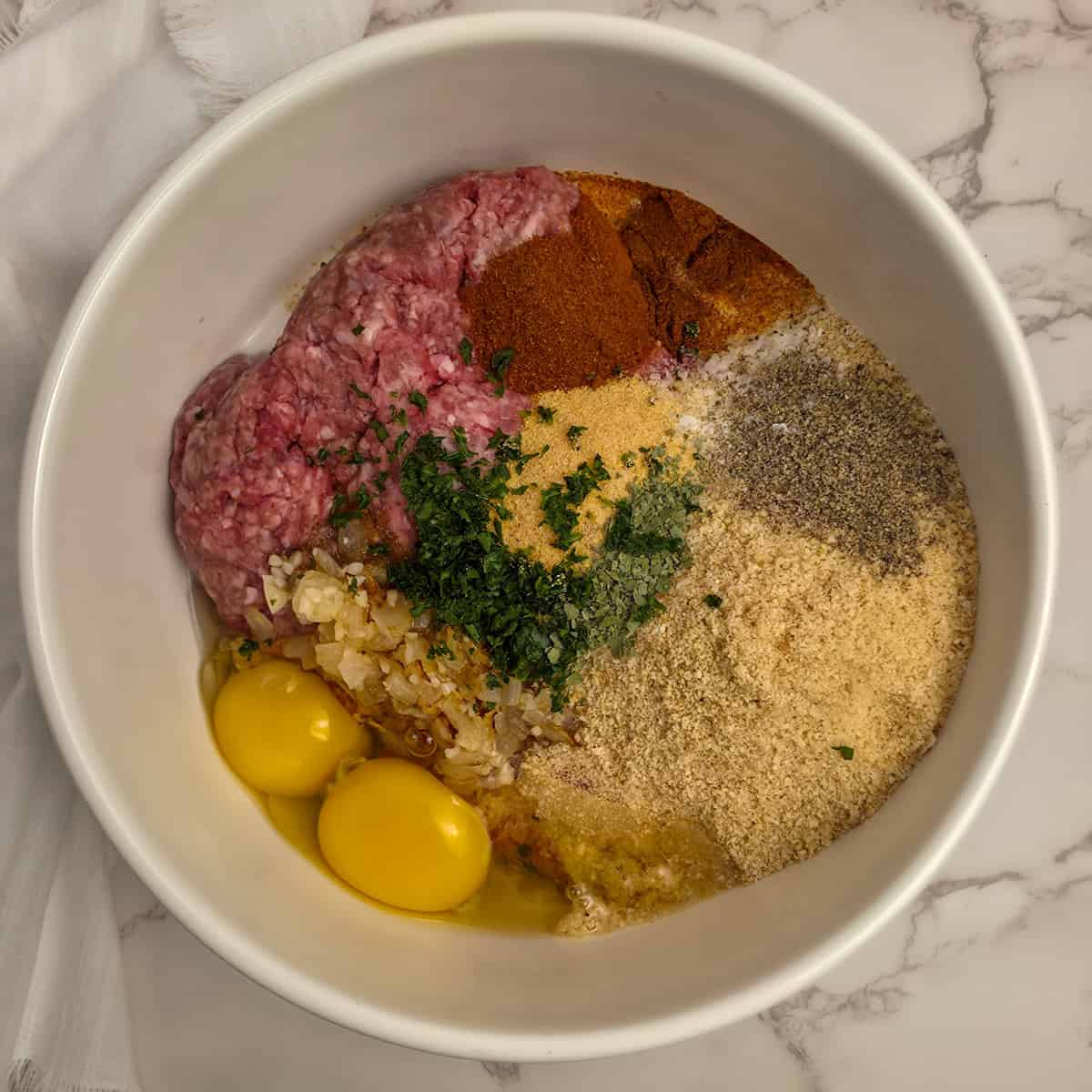 - To the bowl, add in the ground beef, eggs, breadcrumbs, milk, Worcestershire sauce, and all of the seasonings. Mix just until combined. Be careful to not overmix.