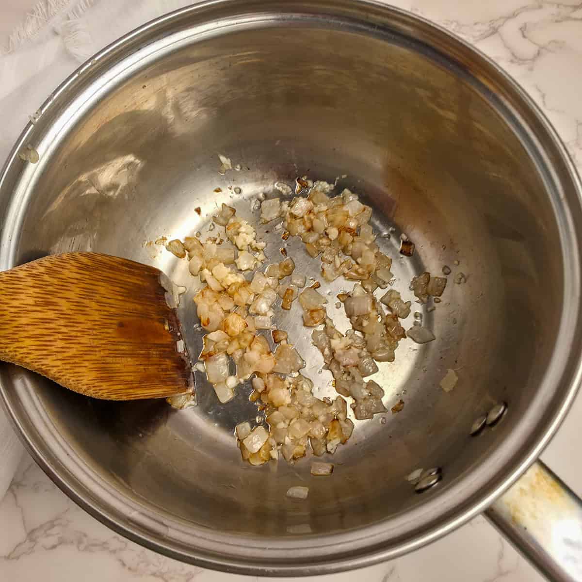 - In a medium saucepan, melt 1 tablespoon of butter over medium heat. Add the diced onions and cook until soft, about 4 minutes. Stir in the minced garlic and cook for another 30 seconds. Remove from the heat and transfer to a large bowl. Set the pan aside, it will be used later to make the gravy.