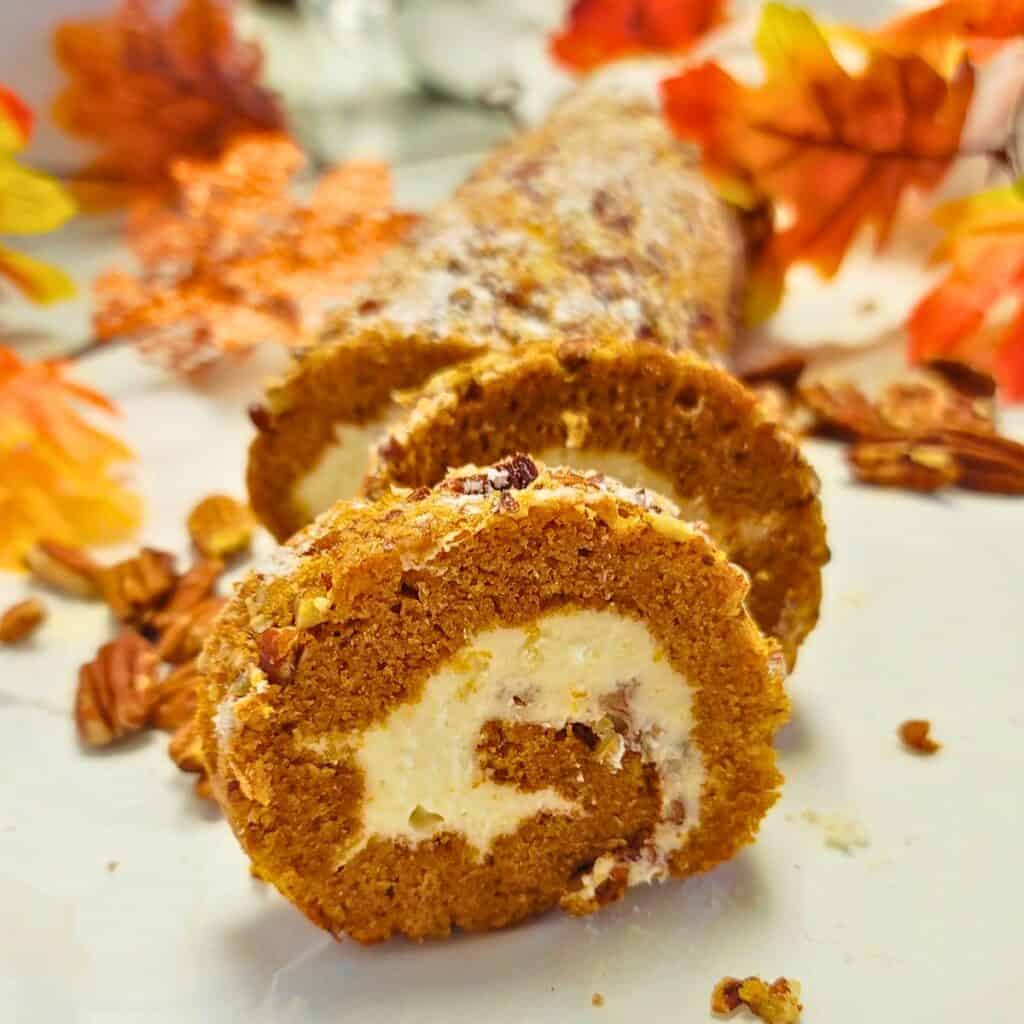 - When you are ready to serve the pumpkin roll lightly dust it with powdered sugar and slice. Enjoy!