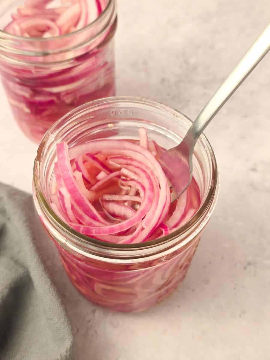 - Add in additional flavor: You can add in red pepper flakes for a spicy pickled onion or crushed garlic for more flavor. Black peppercorns are also a great addition!