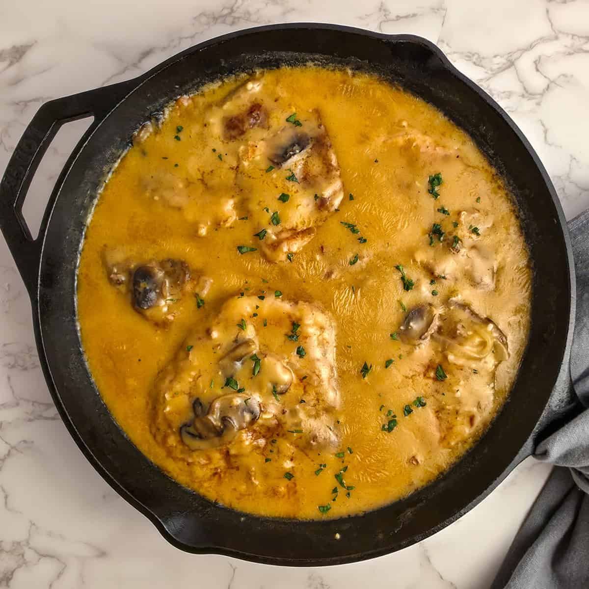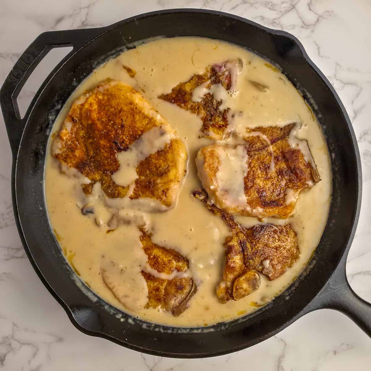 - Return the pork chops back to the pan to simmer until fully cooked. 10-15 minutes.