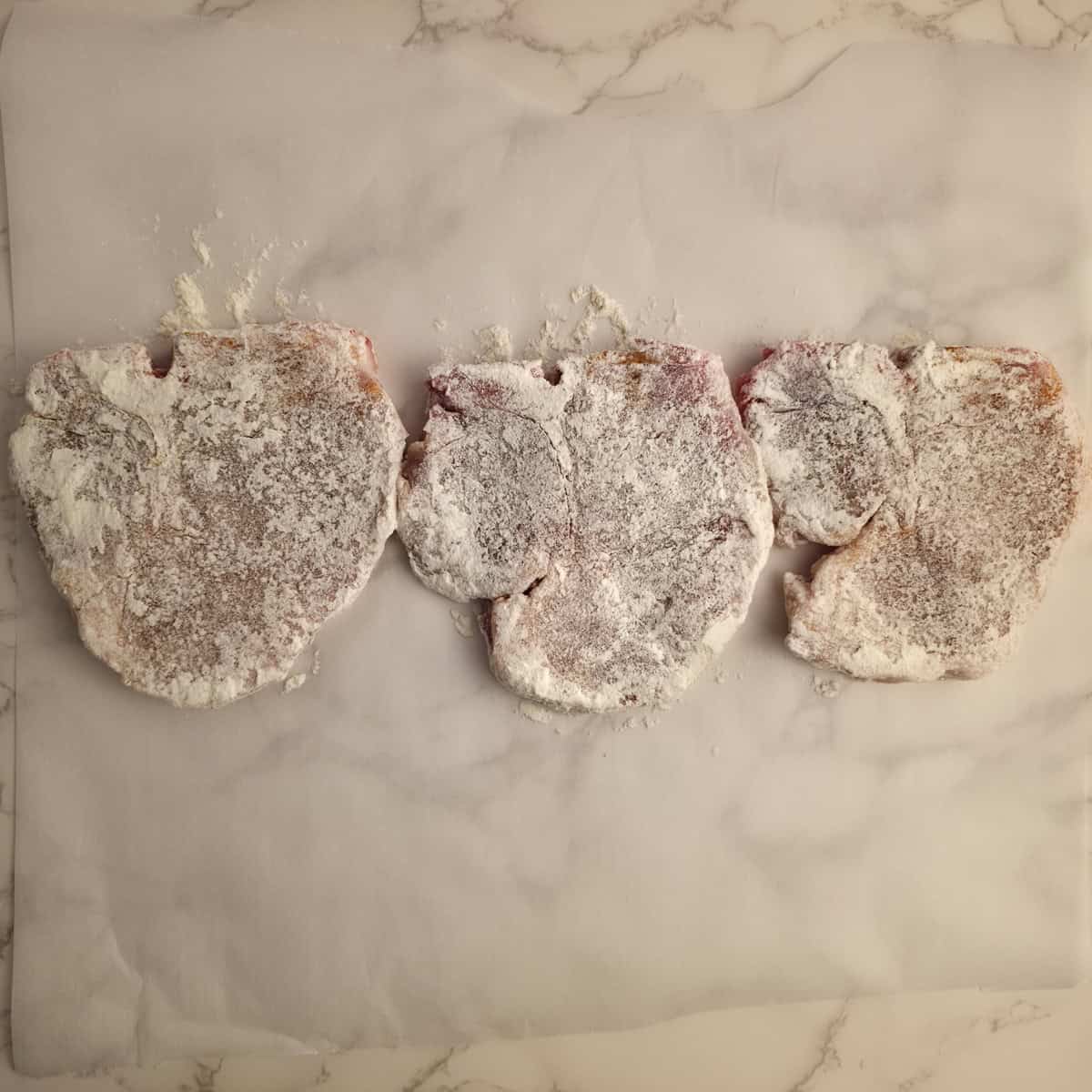 - Pat pork chops dry, season with spices, and dredge in flour.