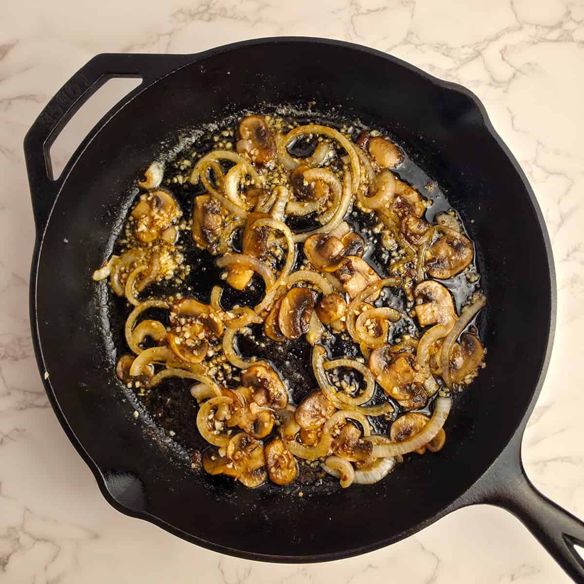 - Drain off all but 2 tablespoons of the oil, then add the butter to the pan. Once melted, add the sliced mushrooms and onions. Cook, stirring often, until tender and lightly browned, about 5-7 minutes. Stir in the minced garlic and cook for another 30 seconds.