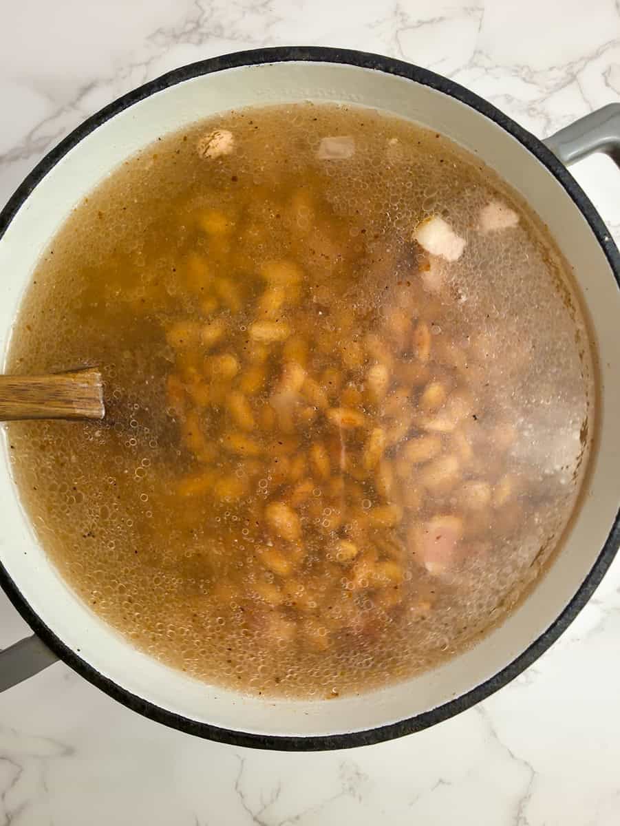 Add the beans, cover them with water, and season. Bring to a boil, cover and reduce to a simmer. Cook for 1 hour. After one hour remove the lid ans cook 30 minutes to thicken the beans a little.