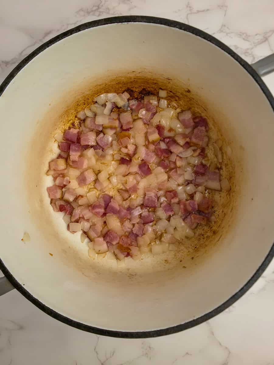 - In a large pot, cook bacon over medium heat until a good amount of fat has rendered off. Stir in the onions and sauté until translucent. About 6 minutes.