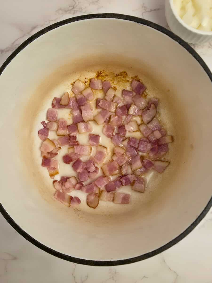 Next, add the bacon to the pot and let it start to render off some of the fat.